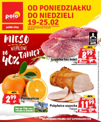 {loadposition linkPoloMarket} 'Mięso wieprzowe do 40% taniej' - nowa gazetka promocyjna sieci sklepów Polo Market. Polecane promocje z gazetki Polo Market: Łopatka bez kości 1 kg - 8,99 zł*. Polędwica sopocka Pekpol 1 kg - 11,99 zł*.…