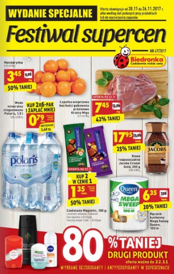 {loadposition linkBiedronka} Wydanie specjalne gazetki promocyjnej sieci sklepów Biedronka - "Festiwal supercen". Polecane promocje z gazetki sieci Biedronka: Łopatka wieprzowa bez kości pakowana prózniowo Kraina Mięs 1 kg - 7,45 zł. Cytryny 1 kg - 4,95 zł.…