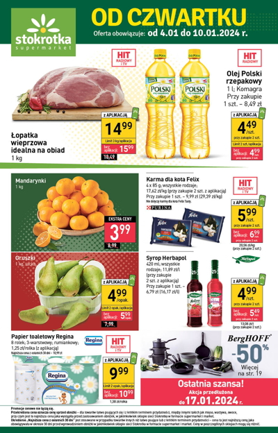 'Od czwartku' - nowa gazetka promocyjna sieci sklepów Stokrotka. Polecane promocje z gazetki Stokrotka: Łopatka wieprzowa idealna na obiad 1 kg - 17,99 zł*. Olej rzepakowy Polski Komagra 1 L - 4,49 zł**. Mandarynki 1 kg - 3,99 zł.…