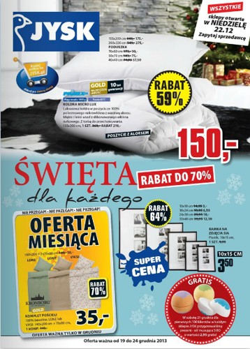 Nowa gazetka promocyjna JYSK - "Święta dla każdego". Polecane promocje z gazetki Jysk: Rabat 25-70% na wszystkie komplety pościeli. Rabat 25-50% na wszystkie dywany. Rabat 20-40% na wszystkie łóżka. Oferta ważna od 19.12 do 24.12.