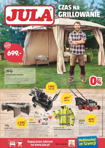 {loadposition linkJula} 'Czas na grillowanie' - nowa gazetka promocyjna sieci handlowej Jula. Polecane promocje z gazetki Jula: Luksusowy pawilon ogrodowy Axley - 699 zł. Zestaw mebli Axley - 2599 zł. Kompresor Stanley 50 L - 1199 zł.…