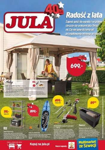 {loadposition linkJula} 'Radość z lata. Zaproś gości do ogrodu i wspólnie cieszcie się urokami lata. Teraz nic Cię nie powstrzyma od przygotowania letniego przyjęcia!' - nowa gazetka promocyjna sieci handlowej Jula. Polecane promocje z gazetki Jula: Luksusowy pawilon ogrodowy…
