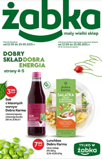 'Latem lubię dobrą karmę' - nowa gazetka promocyjna sieci sklepów Żabka. Polecane promocje z gazetki Żabka: Lunchbox Dobra Karma 155 g - 7,49 zł. Lemoniada Wycisk 400 ml - 3,99 zł*. Sałatka Dobra Karma 180 g - 4,49 zł.…