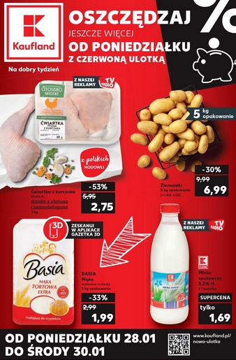 {loadposition linkKaufland} 'Oszczędzaj od początku tygodnia z czerwoną ulotką' - nowa gazetka promocyjna sieci marketów Kaufland. Polecane promocje z gazetki Kaufland: Ćwiartka z kurczaka z polskich hodowli klasa A 1 kg - 2,75 zł. Ziemniaki 5 kg - 6,99…