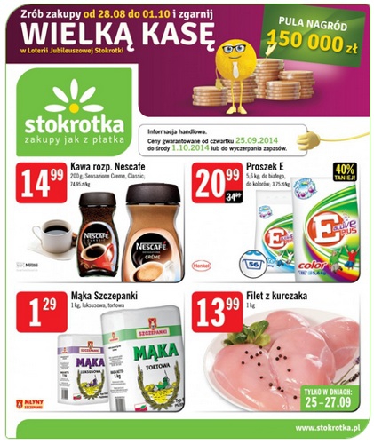 Nowa gazetka promocyjna sieci handlowej Stokrotka. Polecane promocje z gazetki Stokrotka: Kawa rozpuszczalna Nescafe 200 g - 14,99 zł. Proszek do prania E 5,6 kg - 20,99 zł. Mąka Szczepanki 1 kg - 1,29 zł. Oferta ważna…