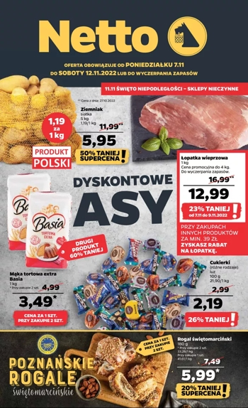 {loadposition linkNetto5} 'Dyskontowe asy' - nowa gazetka promocyjna sieci sklepów Netto. Polecane promocje z gazetki Netto: Ziemniaki 5 kg - 5,95 zł. Mąka tortowa Extra Basia 2x1 kg - 6,98 zł. Łopatka wieprzowa 1 kg - 12,99 zł*. …