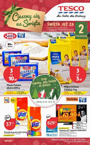 Nowa gazetka promocyjna Tesco - "Cieszmy się na święta". Polecane promocje z gazetki Tesco: Masło Polskie ekstra 3x200 g - 10 zł. Mąka tortowa Tesco 3x1 kg - 3 zł. Telewizor LED 32" Technika 904B AW14 - 629…