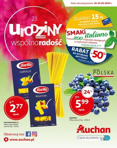 {loadposition linkAuchan} '23 urodziny Auchan' - nowa gazetka promocyjna sieci marketów Auchan. Polecane promocje z gazetki Auchan: Makaron Barilla 500 g - 2,77 zł. Borówki 250 g - 5,99 zł. Ser Camembert Ligueil 2x125 g - 4,30…