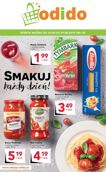 'Smakuj każdy dzień!' - nowa gazetka promocyjna sklepów Odido. Polecane promocje z gazetki Odido: Napój Tymbark 1 L - 1,99 zł. Makaron Barilla 500 g - 3,49 zł. Sos Łowicz 500 g - 4,19 zł. …