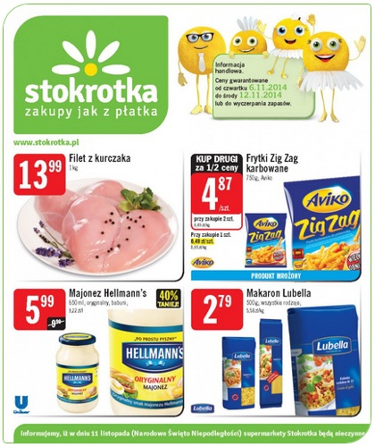Nowa gazetka promocyjna sieci handlowej Stokrotka. Polecane promocje z gazetki Stokrotka: Filet z kurczaka 1 kg - 13,99 zł. Majonez Hellmann's 650 ml - 5,99 zł. Makaron Lubella 500 g - 2,79 zł. Oferta ważna od 6.11…