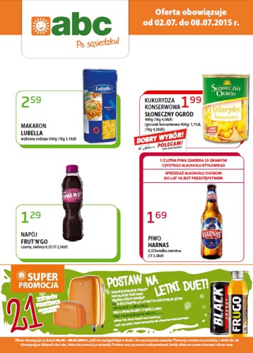 Nowa gazetka promocyjna sklepów ABC. Polecane promocje z gazetki ABC: Makaron Lubella 500 g - 2,59 zł. Kukurydza konserwowa Słoneczny Ogród 400 g - 1,99 zł. Piwo Harnaś 500 ml - 1,69 zł. Oferta ważna od 2.07…