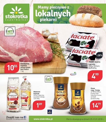 Nowa gazetka promocyjna sieci sklepów Stokrotka -"Mamy pieczywo z lokalnych piekarni". Polecane promocje z gazetki Stokrotka: Delikatna szynka wieprzowa bez kości 1 kg - 10,55 zł. Masło ekstra Łaciate 200 g - 4,99 zł. Makaron Polmak 250 g -…