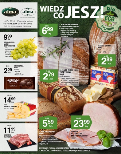 Nowa gazetka promocyjna Delikatesów Alma - "Wiesz co jesz!". Polecane promocje z gazetki Delikatesów Alma: Szynka włoska pieczona Naturi 100 g - 3,99 zł. Jaja z wolnego wybiegu Kotlina Natury klasa L 10 sztuk - 6,99 zł. Makaron…