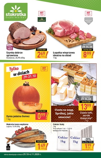 Nowa gazetka promocyjna sieci sklepów Stokrotka. Polecane promocje z gazetki Stokrotka: Szynka dobrze sprawiona Gustavus 100 g - 2,69 zł. Makrela tusza wędzona Laguna 100 g - 1,49 zł. Cukier biały 10x1 kg -19,90 zł. Oferta ważna…