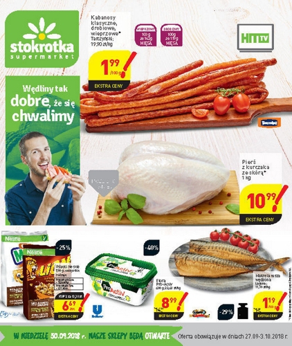 'Wędliny tak dobre, że się chwalimy' - nowa gazetka promocyjna sieci sklepów Stokrotka. Polecane promocje z gazetki Stokrotka: Kabanosy Tarczyński 100 g - 1,99 zł. Pierś z kurczaka ze skórą 1 kg - 10,99 zł. Makrela…