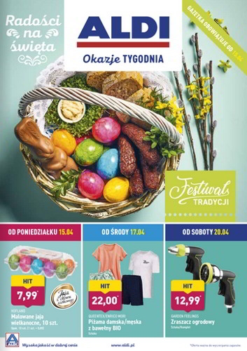 {loadposition linkAldi} 'Radości na święta' - nowa gazetka promocyjna Aldi. Polecane promocje z gazetki Aldi: Malowane jaja wielkanocne Hofland 10 sztuk - 7,99 zł. Piżama z bawełny BIO damska lub męska - 22 zł. Zraszacz ogrodowy Garden…