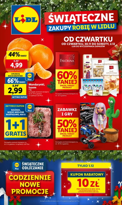 {loadposition linkLidl1} 'Świąteczne zakupy od poniedziałku' - nowa gazetka promocyjna sieci sklepów Lidl. Polecane promocje z gazetki sklepów Lidl: Mandarynki 1 kg - 2,99 zł*. Polski kurczak filet z piersi XXL Rzeźnik 1 kg - 10,99 zł**. Kawa mielona…