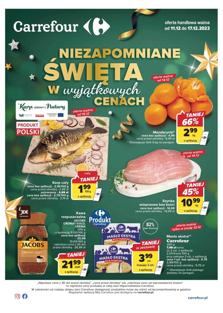 {loadposition linkCarrefour2} 'Niezapomniane święta w wyjątkowych cenach' - nowa gazetka promocyjna sieci marketów Carrefour. Polecane promocje z gazetki Carrefour: Karp cały 100 g - 1,99 zł*. Mandarynki 2,3 kg - 9,99 zł**. Olej rzepakowy Kujawski 1 L - 5,89…