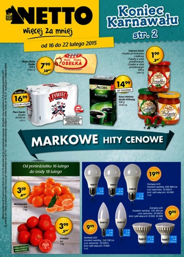 {loadposition linkNetto} Nowa gazetka promocyjna Netto - "Markowe hity cenowe". Polecane promocje z gazetki Netto: Żarówka LED - 9,99 zł. Pomidory 1 kg - 3,99 zł. Mandarynki 1 kg - 3,59 zł. Oferta ważna od 16.02 do…