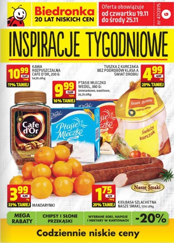 {loadposition linkBiedronka} Nowa gazetka promocyjna sieci handlowej Biedronka - "Inspiracje Tygodniowe". Polecane promocje z gazetki sieci Biedronka: Mandarynki 1 kg - 5,99 zł. Kiełbasa Szlachetna Nasze Smaki 100 g - 1,75 zł. Ptasie Mleczko Wedel 380 g - 9,99…