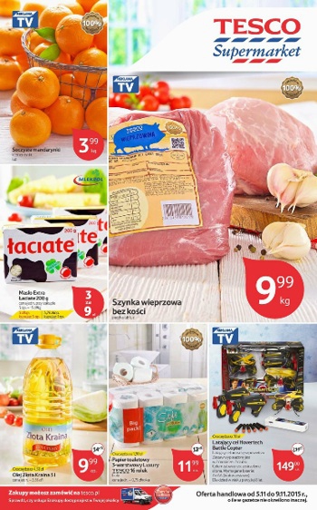 Nowa gazetka promocyjna Tesco. Polecane promocje z gazetki Tesco: Soczyste mandarynki klementynki 1 kg - 3,99 zł. Szynka wieprzowa bez kości 1 kg - 9,99 zł. Latający cel Hovertech Battle Copter - 149 zł. Oferta ważna od…