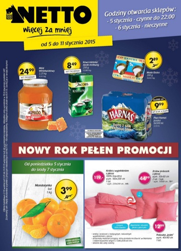 {loadposition linkNetto} Nowa gazetka promocyjna Netto - "Nowy rok pełen promocji". Polecane promocje z gazetki Netto: Miód wielokwiatowy 2,25 kg - 24,99 zł. Kawa mielona Jacobs Kronung 250 g - 8,49 zł. Mandarynki 1 kg - 3,99 zł.…