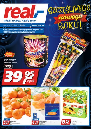 Nowa gazetka promocyjna sieci handlowej Real. Polecane promocje z gazetki Real: Zestaw fajerwerków - 39,95 zł. Mandarynki 1 kg - 2,49 zł. Ćwiartka z kurczaka 1 kg - 4,99 zł. Oferta ważna od 27.12 do 31.12.
