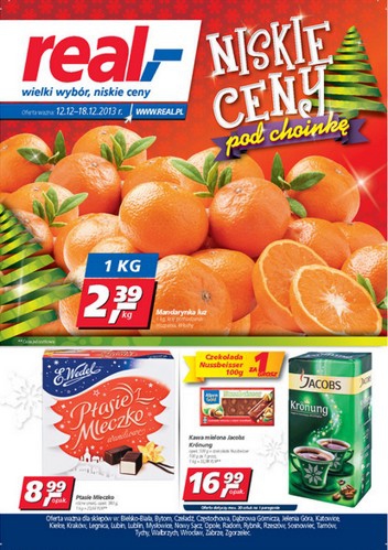Nowa gazetka promocyjna sieci handlowej Real - "Niskie ceny pod choinkę". Polecane promocje z gazetki Real: Mandarynki 1 kg - 2,39 zł. Ptasie Mleczko Wedel 380 g - 8,99 zł. Karp cały 1 kg - 8,89 zł. …
