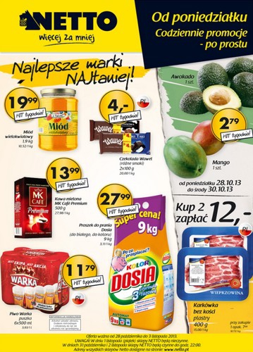 {loadposition linkNetto} Nowa gazetka promocyjna Netto - "Codziennie promocje - po prostu". Polecane promocje z gazetki Netto: Mango 1 sztuka - 2,79 zł. Karkówka bez kości plastry 2x400 g - 12 zł. Proszek do prania Dosia 9 kg…