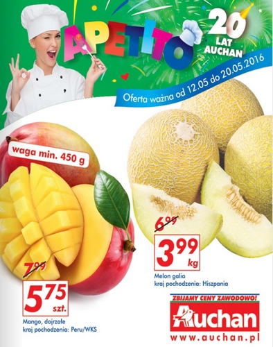 {loadposition linkAuchan} Nowa gazetka promocyjna Auchan - "Apetito. 20 lat Auchan!". Polecane promocje z gazetki Auchan: Mango 1 sztuka - 5,75 zł. Melon galia 1 kg - 3,99 zł. Papryka pepperoni mix 150 g - 5,99 zł. Oferta…