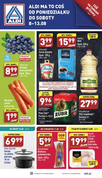 {loadposition linkAldi} 'Aldi ma to coś od poniedziałku do soboty' - nowa gazetka promocyjna sieci sklepów Aldi. Polecane promocje z gazetki Aldi: Borówki amerykańskie 500 g - 8,99 zł. Marchew młoda 1 kg - 1,99 zł. Serek Almette Hochland…