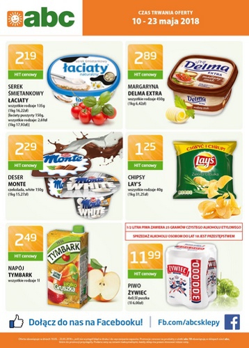 Nowa gazetka promocyjna sieci sklepów ABC. Polecane promocje z gazetki ABC: Serek śmietankowy Łaciaty 135 g - 2,19 zł. Margaryna Delma Extra 450 g - 2,89 zł. Deser Monte 150 g - 2,29 zł. Oferta ważna…
