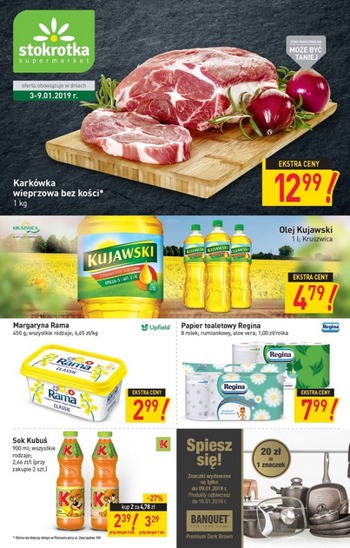 Nowa gazetka promocyjna sieci sklepów Stokrotka. Polecane promocje z gazetki Stokrotka: Karkówka wieprzowa bez kości 1 kg - 12,99 zł. Olej Kujawski 1 L - 4,79 zł. Margaryna Rama 400 g - 2,99 zł. …