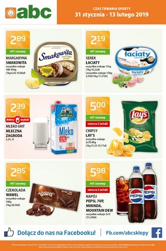 {loadposition linkABC} Nowa gazetka promocyjna sieci sklepów ABC. Polecane promocje z gazetki ABC: Margaryna Smakowita 450 g - 2,89 zł. Serek Łaciaty 135 g - 2,19 zł. Czekolada Wawel 100g - 2,85 zł. Oferta…