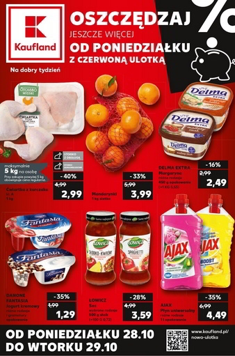 'Oszczędzaj jeszcze więcej od poniedziałku z czerwoną ulotką' - nowa gazetka promocyjna sieci marketów Kaufland. Polecane promocje z gazetki Kaufland: Ćwiartka z kurczaka 1 kg - 2,99 zł. Mandarynki 1 kg - 3,99 zł. Margaryna Delma…