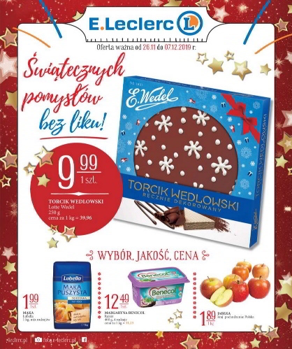 {loadposition linkEleclerc} 'Świątecznych pomysłów bez liku!' - nowa gazetka promocyjna sieci handlowej E.Leclerc. Polecane promocje z gazetki E.Leclerc: Torcik Wedlowski Wedel 250 g - 9,99 zł. Mąka puszysta Lubella 1 kg - 1,99 zł. Margaryna Benecol 400 g…
