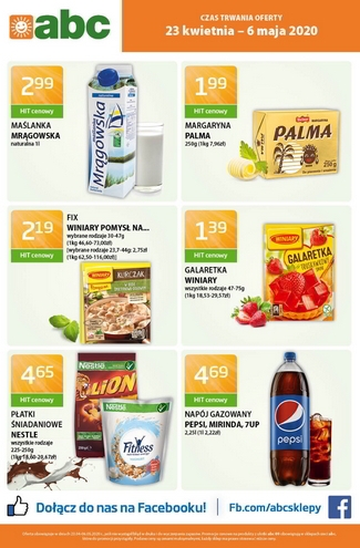 {loadposition linkABC} Nowa gazetka promocyjna sieci sklepów ABC. Polecane promocje z gazetki ABC: Maślanka Mrągowska naturalna 1 L - 2,99 zł. Margaryna Palma 250 g - 1,99 zł. Galaretka Winiary wszystkie rodzaje - 1,39 zł. Oferta ważna…