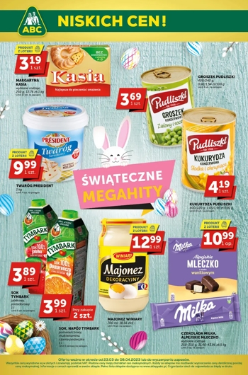 {loadposition linkABC} 'Świąteczne megahity' - nowa gazetka promocyjna sieci sklepów ABC. Polecane promocje z gazetki ABC: Margaryna Kasia 250 g - 3,19 zł*. Sok Tymbark 1 L - 3,89 zł**. Majonez Winiary 700 ml - 12,99 zł***. *…