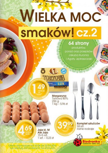 {loadposition linkBiedronka} Nowa gazetka promocyjna sieci handlowej Biedronka - "Wielka moc smaków! cz. 2". Polecane promocje z gazetki sieci Biedronka: Margaryna tortowa 250 g - 1,49 zł. Jaja klasa M Ale Jaja 20 sztuk - 4,69 zł. Komplet sztućców…