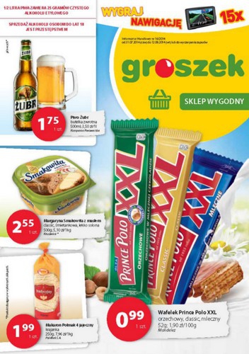 {loadposition linkGroszek} Nowa gazetka promocyjna sieci handlowej Groszek. Polecane promocje z gazetki Groszek: Piwo Żubr 500 ml - 1,75 zł. Margaryna Smakowita z masłem 500 g - 2,55 zł. Wafelek Prince Polo XXL - 0,99 zł. Oferta ważna…