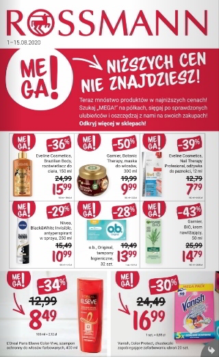 'Niższych cen nie znajdziesz!' - nowa gazetka promocyjna drogerii Rossmann. Polecane promocje z gazetki Rossmann: Rozświetlacz do ciała Eveline Cosmetics Brazilian Body 150 ml - 15,99 zł. Maska do włosów Garnier Botanic Therapy 300 ml - 9,99 zł. Odżywka…
