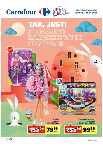 {loadposition linkCarrefour3} 'Tak, jest! Strażnicy zajączkowych tradycji!' - nowa gazetka promocyjna sieci marketów Carrefour. Polecane promocje z gazetki Carrefour: Lalka Barbie Extra Moda - 79,99 zł. Tor samochodowy Psi Patrol Uratujmy Miasto - 99,99 zł. Maskotka pluszowa różne rodzaje…