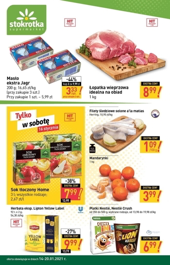 Nowa gazetka promocyjna sieci sklepów Stokrotka. Polecane promocje z gazetki Stokrotka: Masło ekstra Jagr 3x200 g - 9,99 zł. Łopatka wieprzowa idealna na obiad 1 kg - 8,99 zł. Mandarynki 1 kg - 3,99 zł. Oferta ważna…