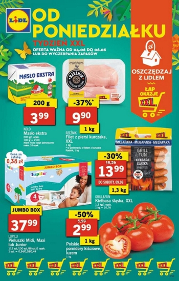 {loadposition linkLidl1} 'Od poniedziałku tydzień XXL' - nowa gazetka promocyjna sieci sklepów Lidl. Polecane promocje z gazetki sklepów Lidl: Masło ekstra Koło 200 g - 3,99 zł. Filet z piersi kurczaka Rzeźnik XXL 1 kg - 9,90…