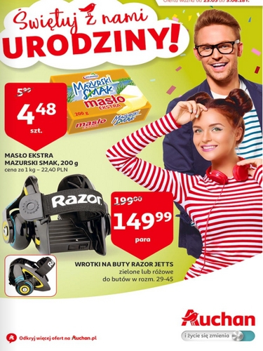 {loadposition linkAuchan} 'Świętuj z nami urodziny!' - nowa gazetka promocyjna sieci marketów Auchan. Polecane promocje z gazetki Auchan: Masło Ekstra Mazurski Smak 200 g - 4,48 zł. Wrotki na buty Razor Jetts - 149,99 zł. Goździk ogrodowy w doniczce…