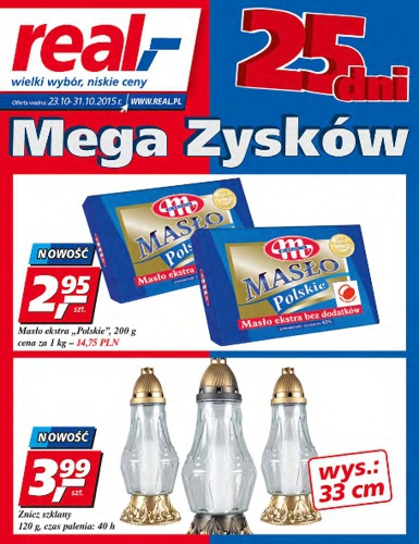 Nowa gazetka promocyjna sieci handlowej Real - "25 dni Mega Zysków". Polecane promocje z gazetki Real: Masło Ekstra Polskie 200 g - 2,95 zł. Znicz szklany 120 g 40 h - 3,99 zł. Olej z pestek winogron Monini…