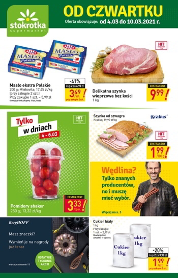 Nowa gazetka promocyjna sieci sklepów Stokrotka. Polecane promocje z gazetki Stokrotka: Masło Ekstra Polskie Mlekovita 2x200 g - 6,98 zł. Delikatna szynka wieprzowa bez kości 1 kg - 9,99 zł. Szynka od szwagra Krakus 100 g - 1,99 zł.…