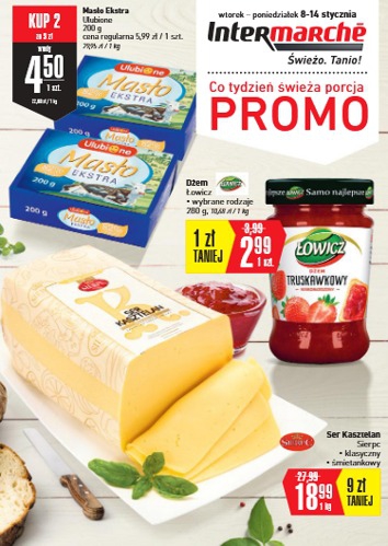 {loadposition linkIntermarche} 'Co tydzień świeża porcja PROMO' - nowa gazetka promocyjna sieci sklepów Intermarche Polecane promocje z gazetki Intermarche: Masło Ekstra Ulubione 2x200 g - 9 zł. Dżem Łowicz 280 g - 2,99 zł. Ser Kasztelan…