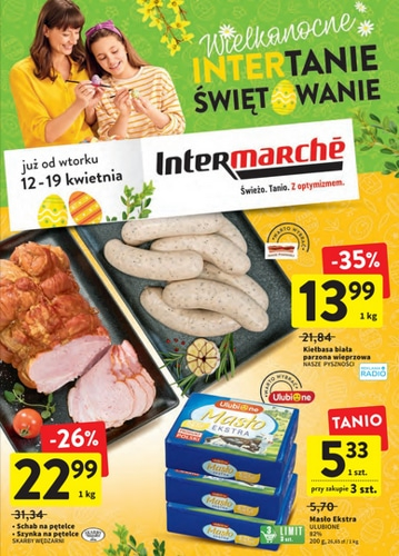 {loadposition linkIntermarche} 'Wielkanocne Intertanie świętowanie' - nowa gazetka promocyjna sieci sklepów Intermarche Polecane promocje z gazetki Intermarche: Kiełbasa biała parzona Nasze Pyszności 1 kg - 13,99 zł. Schab na pętelce Skarby Wędzarni 1 kg - 22,99 zł. Masło ekstra…