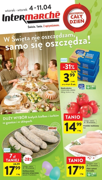 {loadposition linkIntermarche2} 'W Święta nie oszczędzam, samo się oszczędza!' - nowa gazetka promocyjna sieci sklepów Intermarche Polecane promocje z gazetki Intermarche: Kiełbasa biała parzona Nasze Pyszności - 17,99 zł*. Masło ekstra Z Mlecznej Drogi 200 g - 3,99 zł**.…